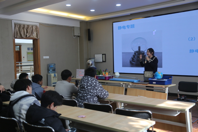 活动伊始,实验教学中心主任、高级实验师王道光老师对远道而来的师生表示热烈欢迎,并简要介绍了学院的基本情况及本次研学的安排。王道光老师与学科教学(物理)专业研究生谢洪艳共同为同学们带来了一场生动有趣的物理科普讲座。通过电吹风侧吹乒乓球、悬浮地球仪、人体发电、锥体上滚、饮水鸟、范式起电机、静电球等多个贴近生活的物理实验,逐步引导学生观察现象、思考原理。讲座过程中还穿插视频讲解与互动体验环节,邀请学生上台参与实验操作,极大地激发了大家对物理世界的好奇与探索热情。