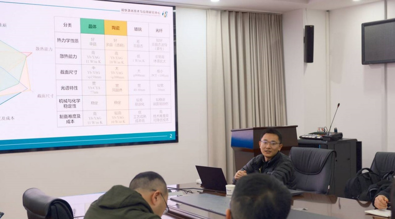 报告结束后,王阁阳助理研究员与现场师生进行了交流,就全固态飞秒激光技术的产生及放大展开了讨论。本次报告加深了师生对高性能掺镱激光晶体的全固态飞秒激光技术的深刻认识,并提供了宝贵的交流机会。